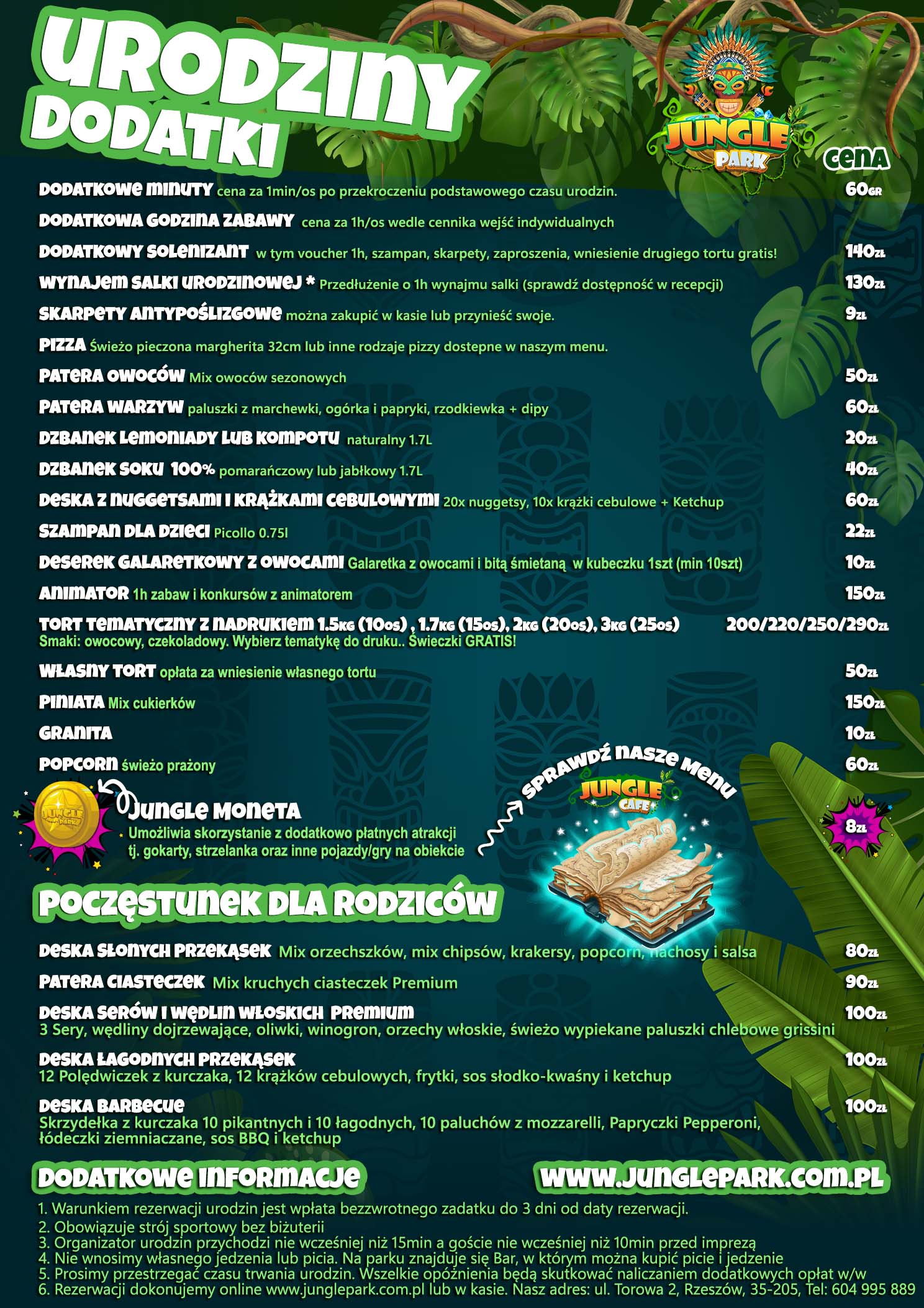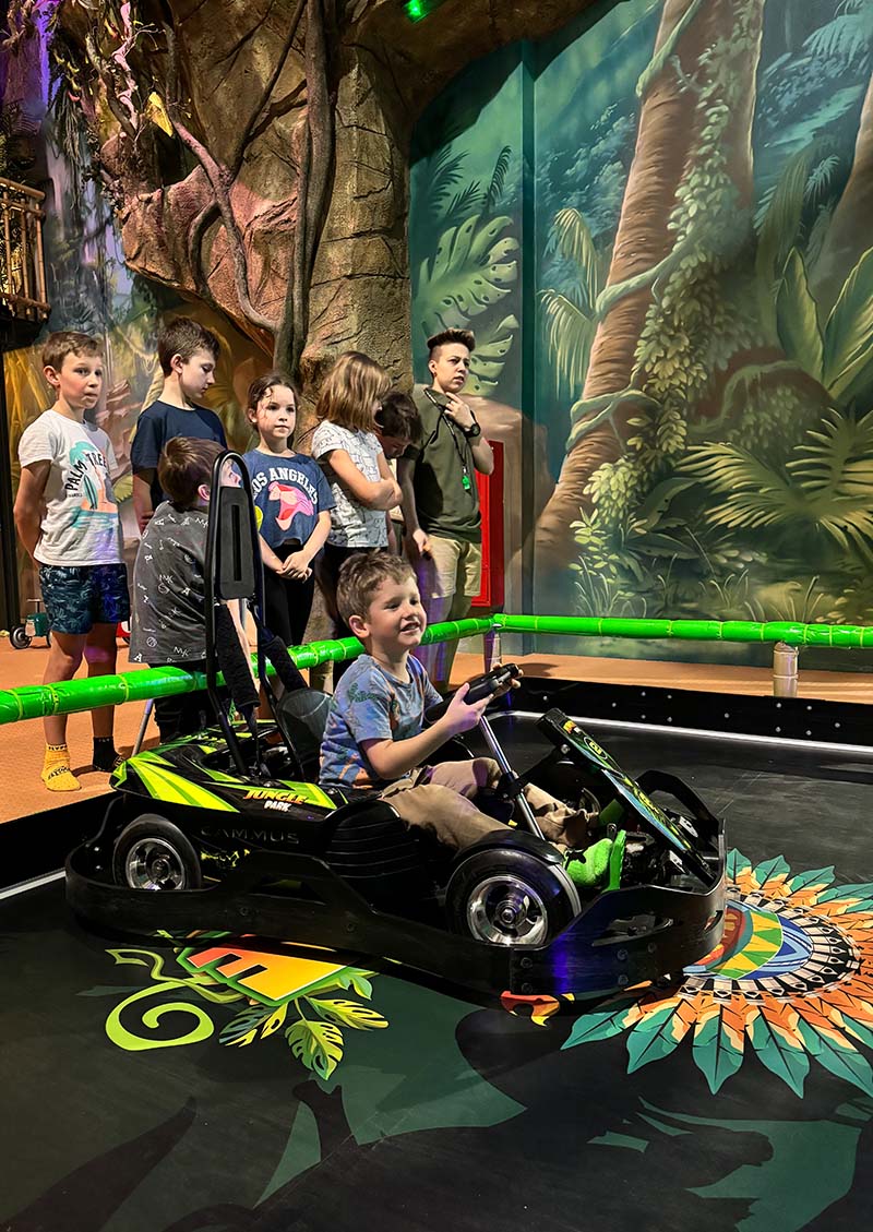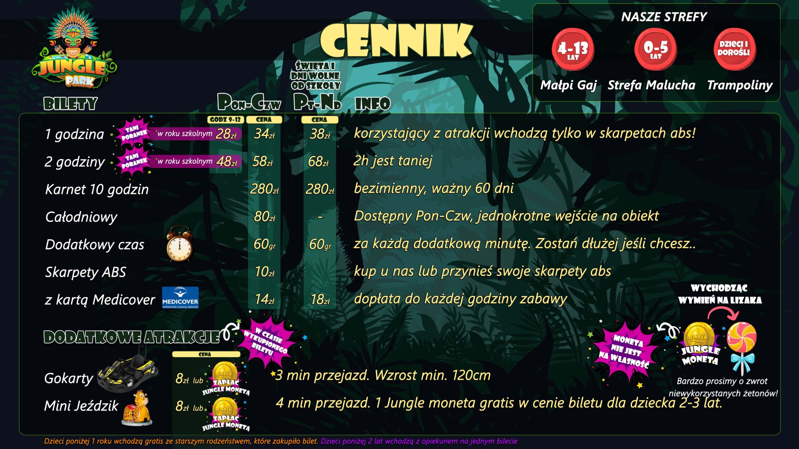 - 90 min zabawy na małpim gaju i trampolinach (dzieci do 4 lat mogą także skorzystać ze strefy malucha).